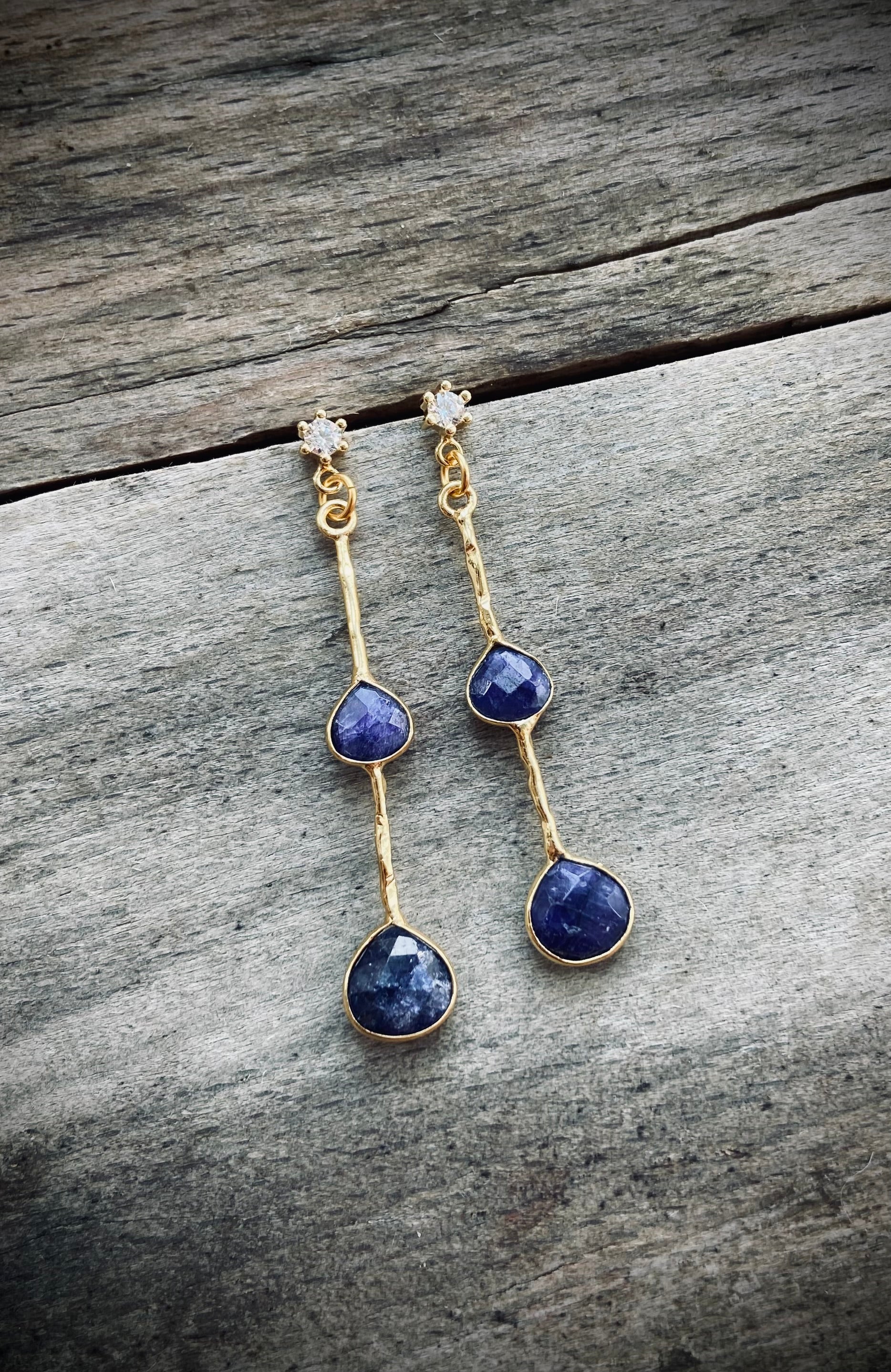 Smukke lange hammerslåede øreringe med blå safir ædelsten på ørestikkere af forgyldt sterling sølv og zirkoner.