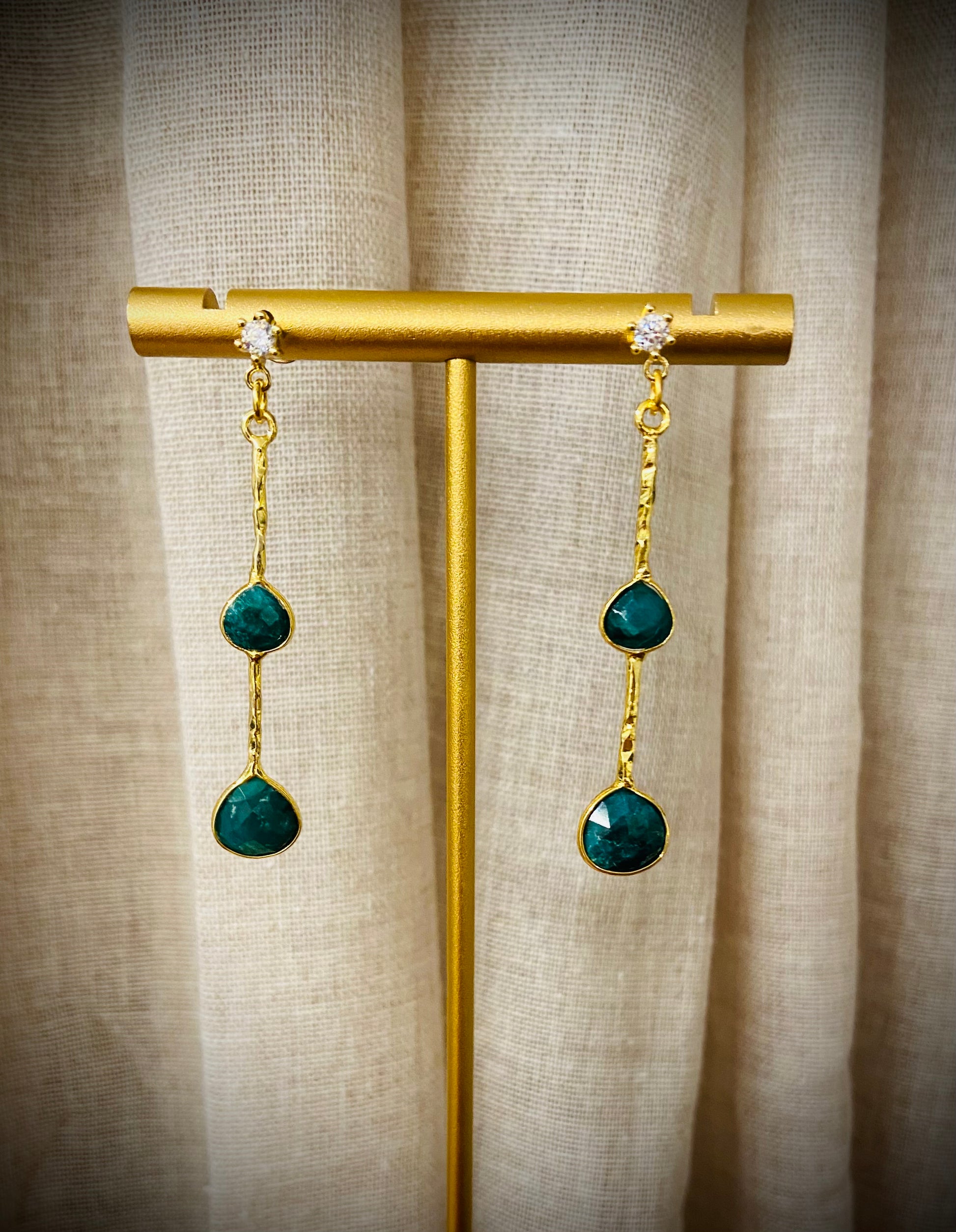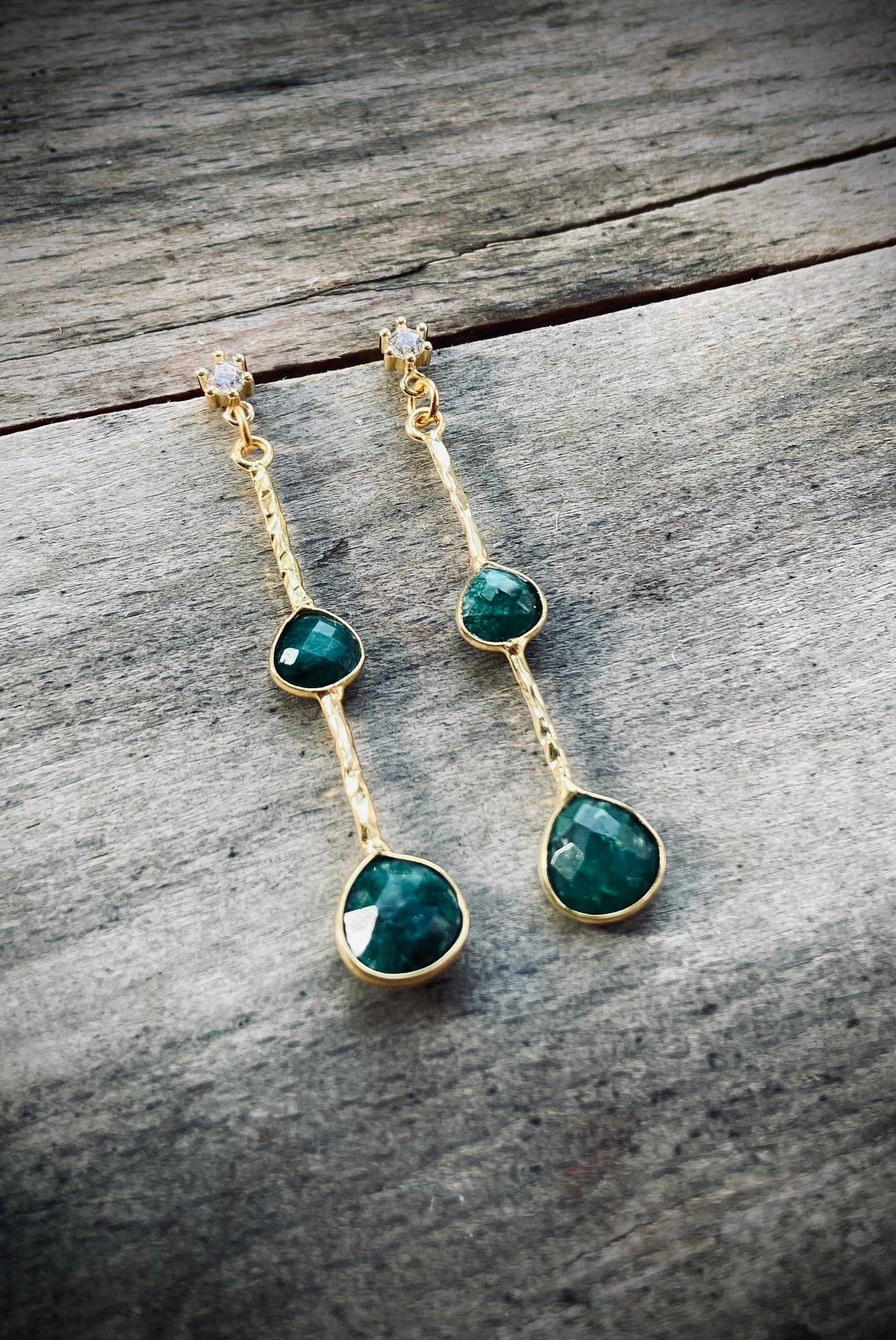 Smukke lange hammerslåede øreringe med grøn smaragd ædelsten på ørestikkere af forgyldt sterling sølv og zirkoner.