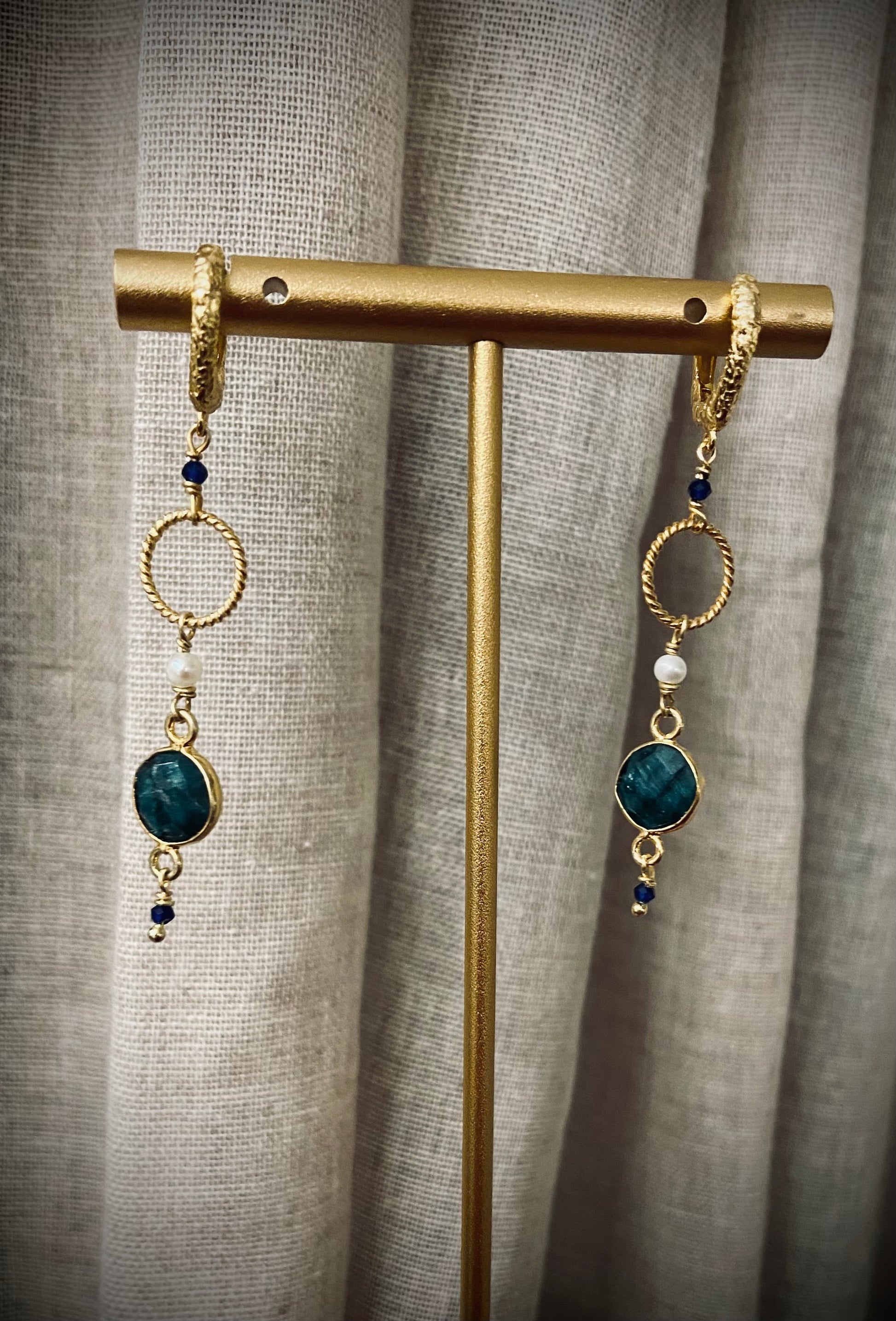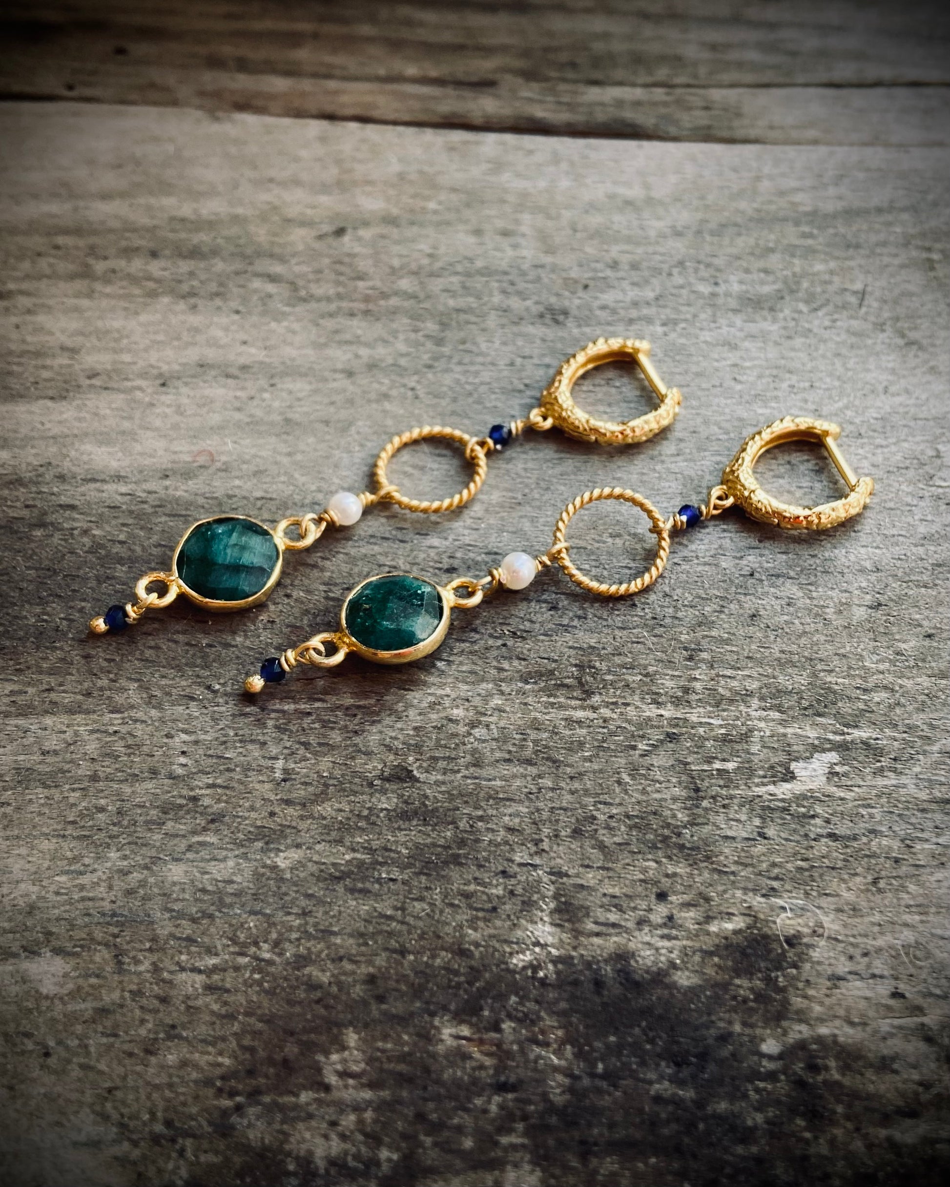 Utrolig smukke lange elegante øreringe med grønne smaragd sten, små blå agat og hvide ferskvandsperler.