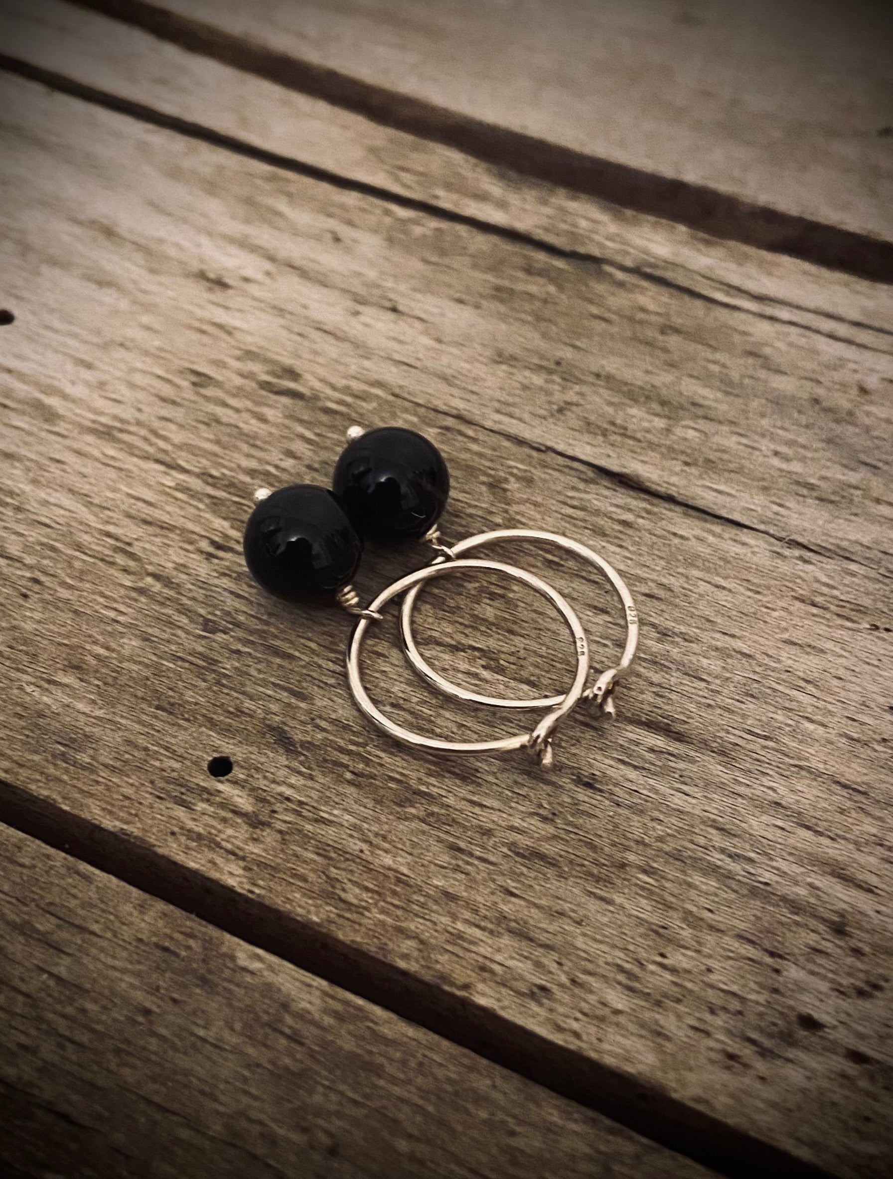 Enkle 15mm creoler i sterling sølv med blanke runde sten af 8mm sort Onyx.