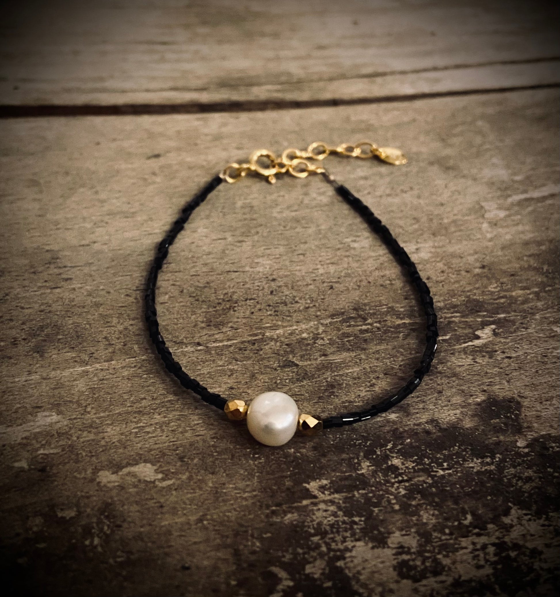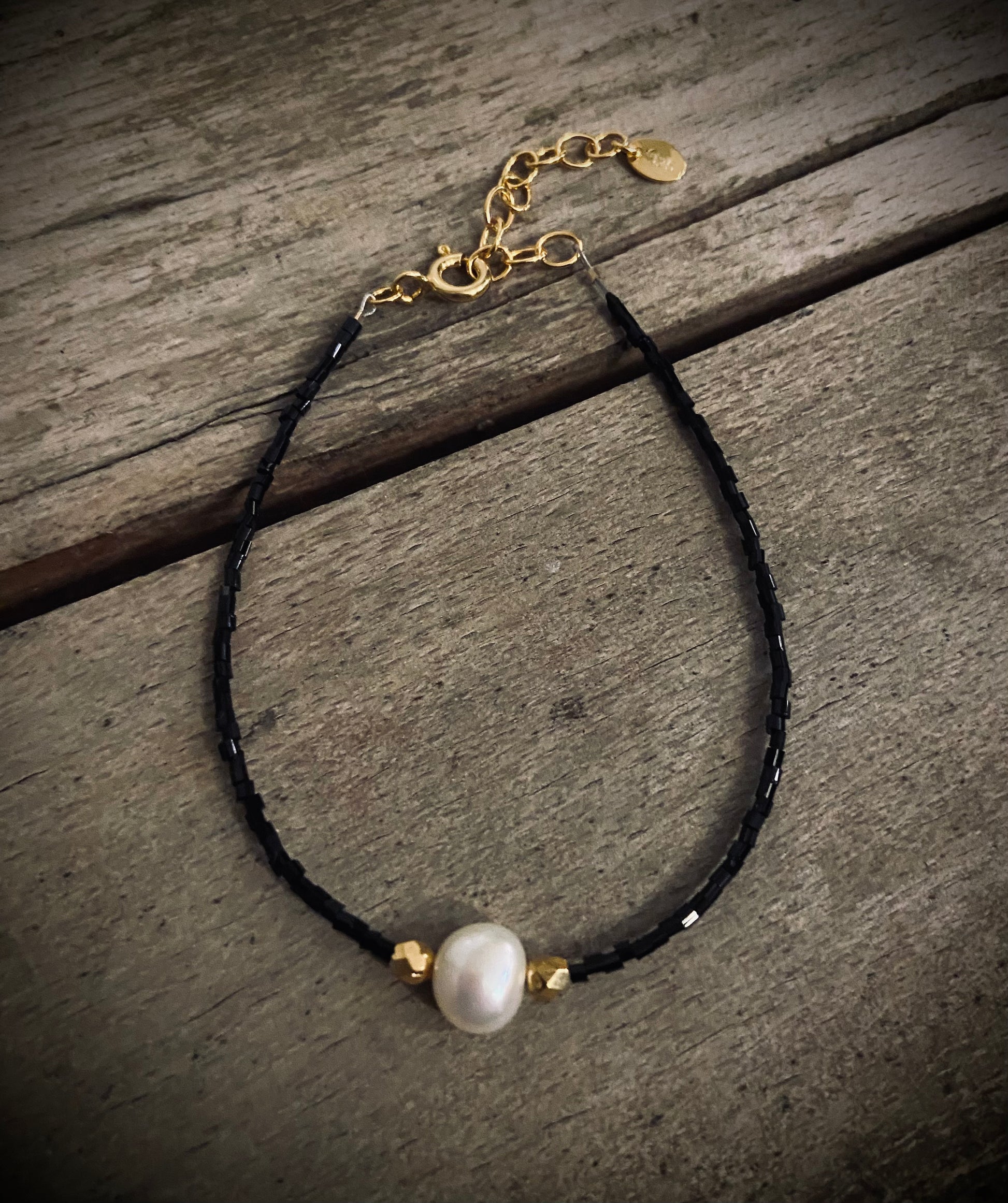 Armbånd med justerbar lås 16-20cm af forgyldt sterling sølv påsat sorte funklende glasperler og en smuk ægte AA kvalitet ferskvandsperle.